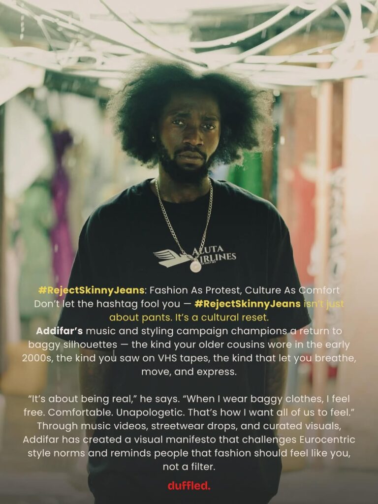 I take that history and rebuild it into something fresh, something that reflects today’s energy but still carries yesterday’s soul.” Don’t let the hashtag fool you — #rejectskinnyjeans isn’t just about pants. It’s a cultural reset. @addifar_himself ‘s music and styling campaign champions a return to baggy silhouettes — the kind your older cousins wore in the early 2000s, the kind you saw on VHS tapes, the kind that let you breathe, move, and express. “It’s about being real,” he says. “When I wear baggy clothes, I feel free. Comfortable. Unapologetic. That’s how I want all of us to feel.” Beyond aesthetics, Addifar’s work is steeped in purpose.